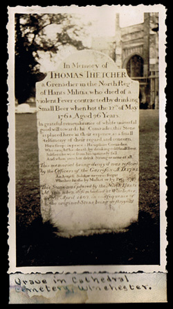 a Grenadier in the North Regiment of Hants Militia, who died of a violent Fever contracted by drinking Small Beer when hot, the 12th of May 1764, Aged 26 Years.