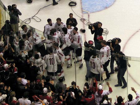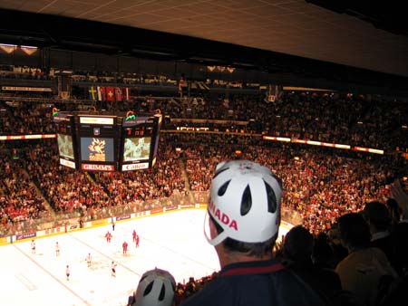 The guy on my right didn’t know shit about hockey and kept yelling for people to sit down when they were celebrating or cheering during times like this video (911kb wmv) of Canada’s first goal. Not to mention the fact he couldn’t sit still and when he stood up he put his smelly arse in my face.