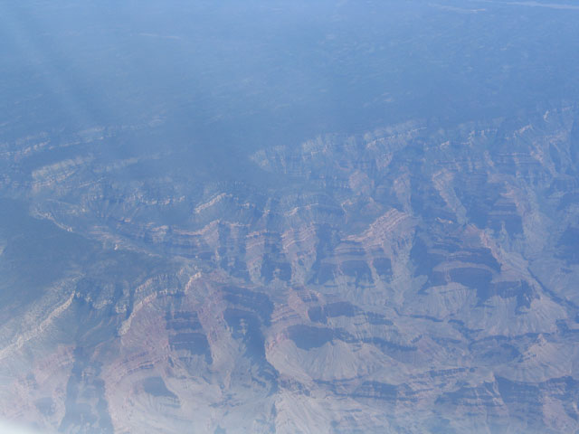 de plane!After Customs came the bag drop-off. The conveyor belts weren’t working so I obsessed about my bags all the way through the security check, but relaxed when I saw them tossing bags like maniacs onto one belt now working. I made my way to gate 91. On my way through the terminal I took note of the wee little commuter jet at the gate I was leaving from. I took a picture (at left), but it doesn’t really do the teeny-tinker toy justice. It was a Canadair Regional Jet (CRJ – 900) capacity 80 seats (6 First/74 coach) with a cruising speed of 500 mph (if the squirrels can run fast enough). We were shoe-horned on to the cramped little plane (I hit my head three times and I am NOT tall), my window seat turned out to be a bulkhead with a window blocked my seat and the seat ahead of me. ARGH! The guy next to me was an arm rest hog, the inflight meal was a tiny bag of mini-pretzels (evil carbs, but I was damned hungry). The first leg wasn’t a complete bust, I had a good nap and did get to see the Grand Canyon as when I leaned my seat back I could peer out the window. I even took a few pictures.