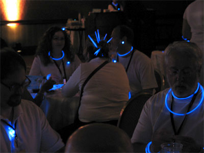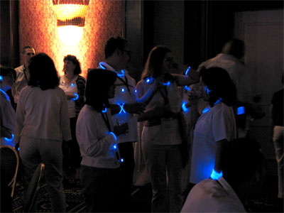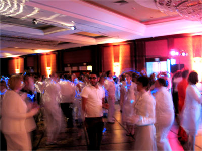 Finally, I went to the How Conference Tuesday Night Reception aka The White Party put on by Neenah Paper a good time was had by all. Everyone was dressed in white and was given blue glow sticks and little battery operated and magnetic LED lights to decorate them selves with. Here are three pictures I took …