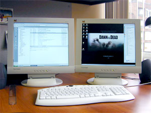Also, upon my arrival this morning, I noticed I now have on my desk. The dual head video card kind of sucks but after a minute or two of ranting it looks as though we’ll be getting better cards later on today.
