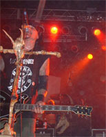 Carol and I went to the Ministry show last night. We had a gas! There was the usual possé of whackos that we see at the metal shows we go to. I guess it’s a fairly small community so we often see the same folks from show to show. The first band, Hanzel und Gretyl, were great. Their set was extremely loud and mostly in German (which I don’t understand), but cool all the same. It was unsettling to see a creepy German dude marching around dressed up like the Kaiser with two skinny ugly chicks and a drummer who kept standing up on his kit and flipping off the crowd. They started off with a song in English called “Third Reich from the Sun”. Here’s a sample: 3rd-reich-sample.mp3 (240kb MP3). You can hear the whole thing on their website under the “interactive” section. We must buy the CD. Here’s a review of Uber Alles.