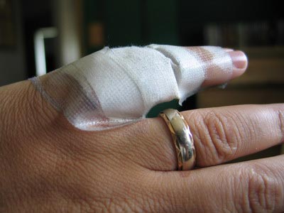 Underneath the bandage is a deep puncture wound only a few millimeters wide but very deep. I bled like a stuck pig all over the parking lot and my clothes (namely my favourite jeans and nice green shirt). The security folks who were luckily still on site assisted getting the bleeding stopped and then I drove myself to the hospital where I sat for (thankfully) only an hour before I got patched up, given a tetanus shot and booted. I then had to go and buy new pants and new jeans before heading back to work as I looked like a murder victim in my bloodstained duds. Not very Christmassy at all.
