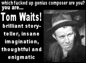 Tom Waits… charismatic story-teller with a penchant for freaky people and unusual settings. You thrive on the concept of the underdog coming out on top. Take this quiz!