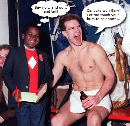 Mark Messier always gave me the creeps. The picture kind of says it all… At least they’re happy about the ‘nucks win tonight.
