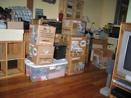 This morning I rolled out of bed and went at it again. After putting away my 450+ DVDs and setting up Carol’s computer I headed outside to the dreaded garage. We still had stuff to move from the garage into the house as our helpers (at my urging as I felt sorry for them) left many boxes there. There was so much crap in there that I couldn’t fit the car in. It’s a two car garage and we have a Hyundai Elantra. Yikes! Yes, what you’re visualizing is probably fairly close to reality. I moved all of Art and Jo’s stuff (they’re our landlords) to one side and ours to the other. Then I took what belonged in the garage from the house and vice versa. All this took about four hours, but there were rewards: