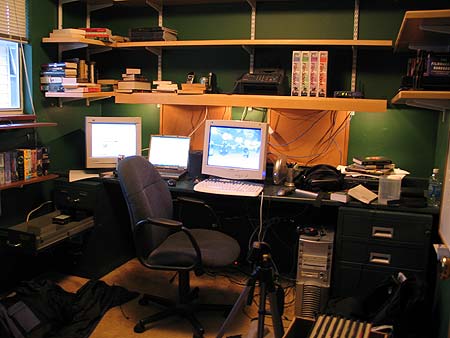 It seems we had more stuff than we thought and this whole moving twice in 6 months thing is making me very tired. My office is coming along nicely and looking much like NASA’s control center in Houston. Not that there’s anything wrong with that. Below is a picture of a work in progress. Eventually everything will be put in its place, books will be on the shelves and wires will be neatly squared away: